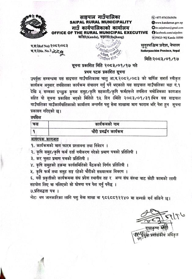 » चौरी प्रवर्द्धन कार्यक्रम मा प्रस्तावना पेश गर्ने सम्बन्धी सूचना ।